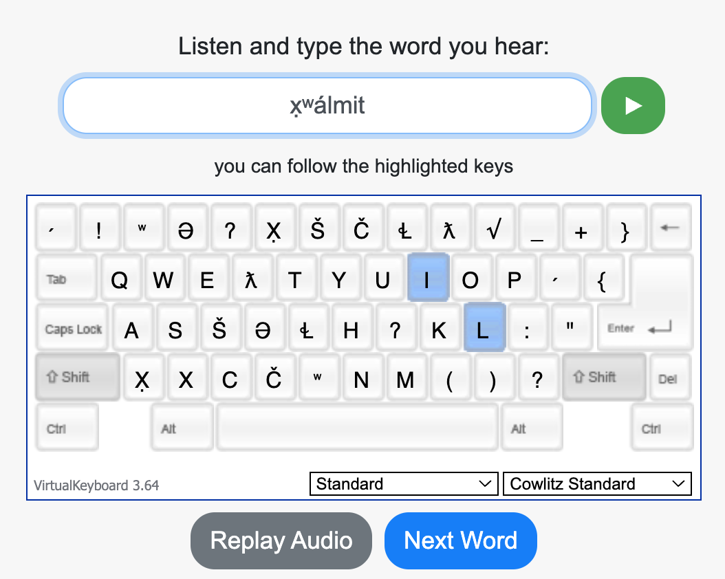 Typing Practice helps you learn to spell and type words in Cowlitz. Click the Typing Practice button in the menu to begin. Listen to the audio, then type the word you hear using your keyboard or the onscreen keyboard. Get instant feedback and corrections, and try the next word to keep practicing!