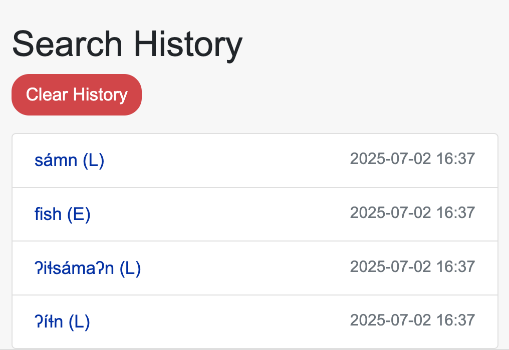 Your search and entry history is saved automatically. Click the History button in the menu to view words and entries you've recently looked up. This helps you revisit and review words you've explored before.