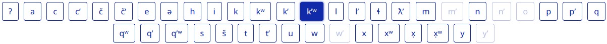 Selecting Cowlitz enables searching in the Cowlitz language. It also sets the alphabet to only include letters used in Cowlitz. Searching in Cowlitz will allow you to access dictionary entries directly. Click a letter to start browsing or start typing to search. A virtual Cowlitz keyboard appears at the bottom at the page and your keyboard becomes the Cowlitz keyboard as you start typing.