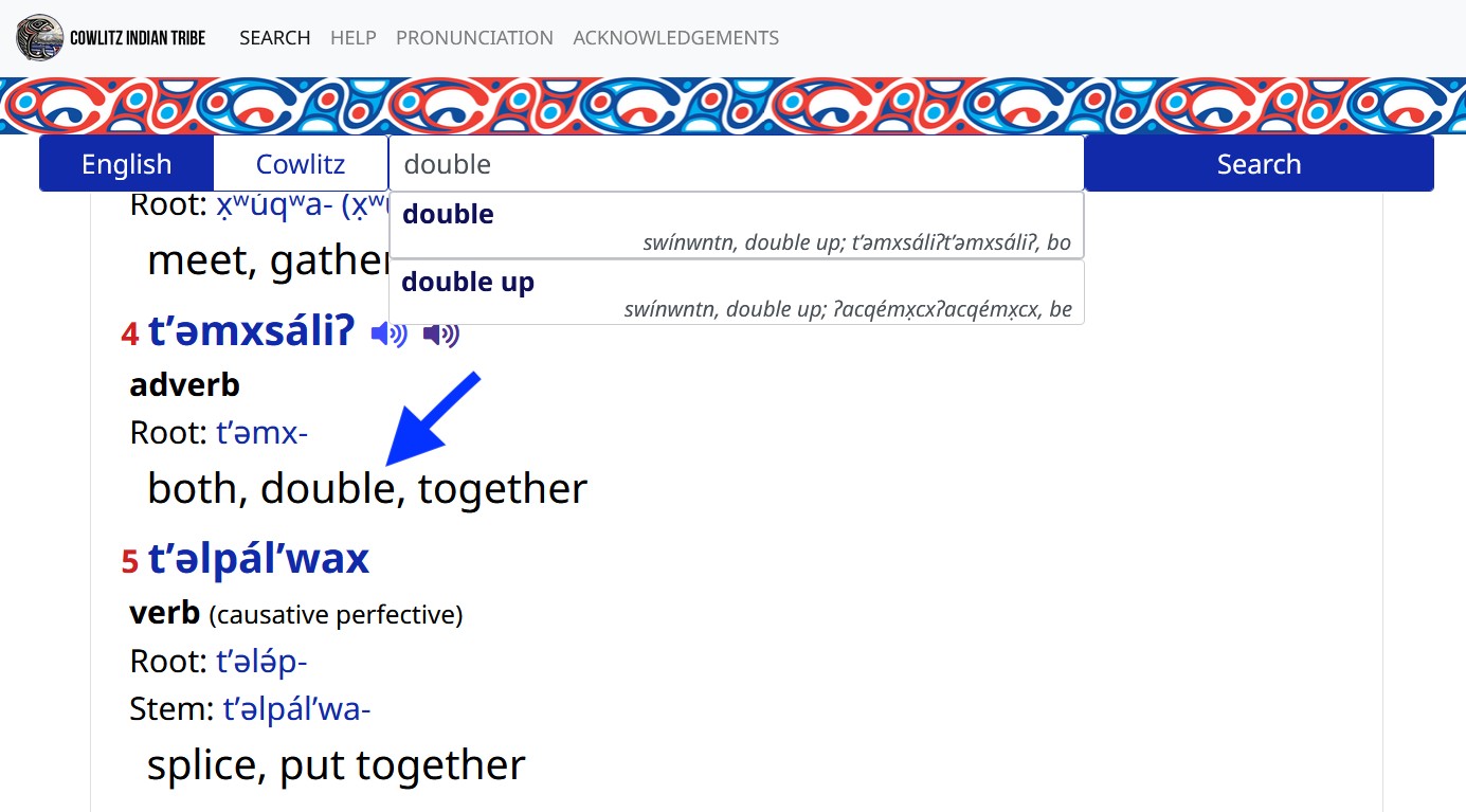 Click on words within an entry to search for those Cowlitz or English words within the dictionary. Hit Enter or Click the result to proceed to the entry.